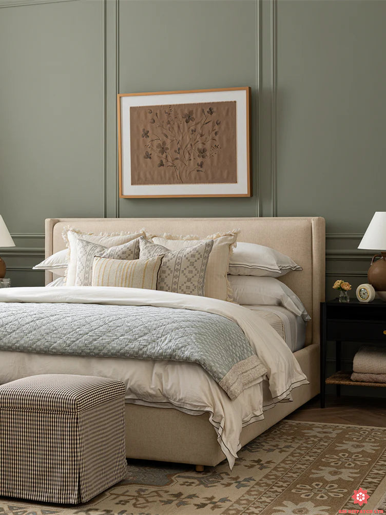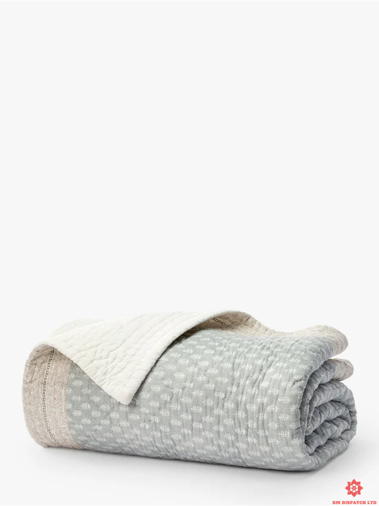 Our wave-print quilt adds texture and elegance to your bedding. Hand-printed in soft blue, olive green, and dark brown, this cotton quilt showcases exquisite craftsmanship and unique character. Made from 100% cotton, it offers warmth, comfort, and stylish aesthetic.